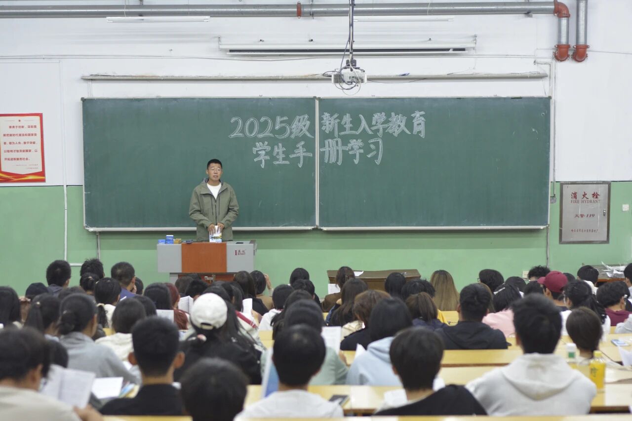 为引导新生树牢规矩意识和责任意识,明确校规校纪,近日,基础科学学院组织全体2025级新生开展《学生手册》专题学习活动,2025级辅导员赵宇航担任主讲。