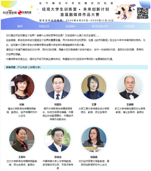 经观大学生训练营-未来创新计划暨首届融媒体作品大赛由《经济观察报》主办,作为全国三大经济类报刊之一,《经济观察报》是中国新生的学术、商业和舆论领袖交流与对话的平台。经观大学生训练营已经举办十三届,以培养复合应用型创新媒体人才的社会使命,同步进行专家讲座、企业走访、教学经验交流等活动。本次大赛得到了清华大学新闻与传播学院经济传播研究中心、对外经济贸易大学企业与战略研究所产业创新研究中心等高校的学术支持,同时也有来自中国经济网、环球网、中新经纬、每日经济新闻、21世纪经济报道等头部财经媒体的支持。