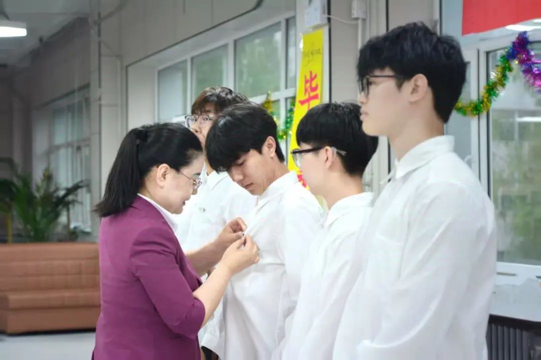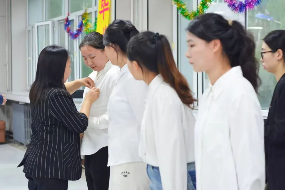学院党委书记许蕾、院长焦艳会为毕业生代表佩戴校徽